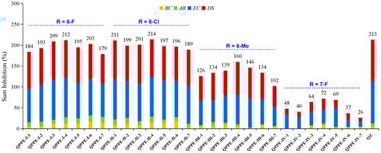 To obtain a detailed SAR of the series compounds QPPE-I and QPPE-II, and to further explore their herbicidal activities against monocotyledonous plants, we performed a second round of herbicidal activity screening by using a dose reduction with serial two-fold dilutions method. As observed in Figure 4, the herbicidal activity of series compounds QPPE-I and QPPE-II became progressively lower with the dosage decreased from 75 to 9.4 g ha−1, and all of the tested compounds had lower herbicidal activity than that of quizalofop-p-ethyl. Delightfully, however, the most active target compound QPPE-I-4 still displayed moderate herbicidal activity against the two tested weeds, with a sum inhibition rate of 105% at a dosage of 9.4 g ha−1. This finding demonstrated that compound QPPE-I-4 could be selected as a potential lead compound for further study. Moreover, upon decreasing the dosage, the SAR of series compounds QPPE-I and QPPE-II becomes gradually obvious. At a lower dosage, the series compound QPPE-I (R = 6-F) displayed better sum herbicidal activity against the two tested weeds than that of the corresponding series compound QPPE-II (R = 6-Cl) on the whole, which may be attributed to the fact that the introduction of a fluorine atom into the target compounds could improve their stability and, in turn, could potentially be advantageous to herbicidal activity [35,36].
