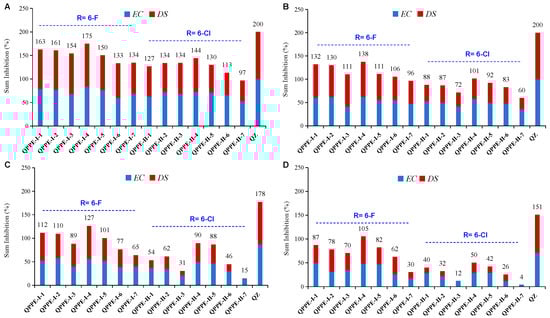 Effects (% inhibition) of the target compounds on the loss of plant weight at different dosages in greenhouse testing; (A) at a dosage of 75 g ha−1; (B) at a dosage of 37.5 g ha−1; (C) at a dosage of 18.8 g ha−1; and (D) at a dosage of 9.4 g ha−1; EC: E. crusgalli; DS: D. sanguinalis.
