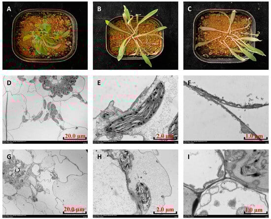 Phenotype of P. miliaceum seedlings ((A), control; (B), treated with QPPE-I-4; (C), treated with QZ) and TEM images of P. miliaceum leaf cells (control: (D–F); treated with QPPE-I-4: (G–I)).