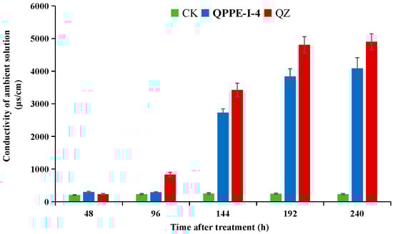 According to a previous method [34], when P. miliaceum was grown to the 2-leaf stage, seedlings was treated with QPPE-I-4 and QZ at a dosage of 150 g ha−1, respectively. At 48, 96, 144, 192, and 240 h after the treatment, leaves of the plants were excised at a petiole. The excised leaves were soaked into 10 mL of distilled water in a beaker and shaken gently in a water bath at room temperature. After 3 h, the conductivity of the ambient solution was measured with an electric conductivity meter (DDS-307, INESA, Shanghai, China).