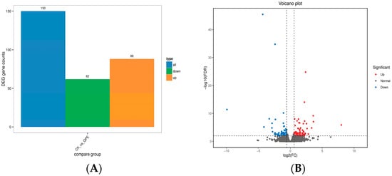 Bar chart (A) and volcano plot (B) of gene expression in P. miliaceum leaves after being treated with QPPE-I-4 for 1 h.
