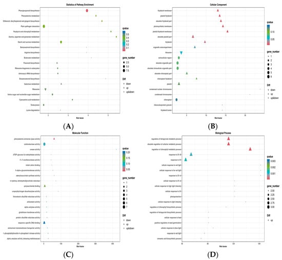 RNA sequencing analysis of P. miliaceum treated by QPPE-I-4. (A) KEGG analysis of differential expression genes; GO analysis of differential expression genes: (B) cell component; (C) molecular function; (D) biological process.