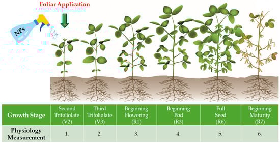 In our previous short-term empirical outcomes with other plants, ZnO-NPs positive physiological responses were observed typically one month after the second foliar application of NFs at a statistically significant level in sunflower [13] and lentil [15], as well as in extending critical metabolic–energetic processes during the vegetation period in foxtail millet [14]. Results of this agronomic study demonstrated that a single foliar application of nanofertilizers (NFs) was sufficient for soybeans, potentially lowering the financial costs associated with fertilizer use.