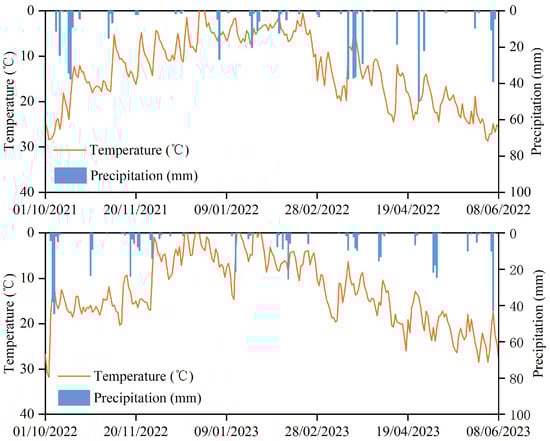 The experiment station was located at the Agricultural Soil and Water Experimental Station of Yangzhou University (32°24′ N, 119°26′ E and about 10 m above sea level), and the experiment was carried out from October 2021 to June 2023. The area has a subtropical monsoon humid climate. The average annual temperature is 14.8 °C, the annual rainfall is 1065.5 mm and the rainfall is mainly concentrated in May to August. The climate parameters data are shown in Figure 1, and the rainfall in the wheat season of 2021–2022 and 2022–2023 was 344.8 mm and 357.4 mm, respectively. The concentrations of total nitrogen, total phosphorus and total potassium in the 0–20 cm soil of the experimental field were 0.71 g/kg, 0.53 g/kg and 5.12 g/kg, respectively. Other soil basic physical and chemical properties are shown in Table 1.