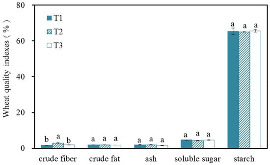 The quality indexes of the winter wheat grains under different fertilizer treatments in 2021–2022 are shown in Figure 2. The concentrations of crude fiber, crude fat, ash, soluble sugar and starch in winter wheat grains for the T1, T2 and T3 treatments were 1.69–2.95%, 1.83–1.92%, 1.53–1.93%, 4.26–4.77% and 65.1–65.4%, respectively. The significant analysis showed that there was no significant difference in the quality indexes among different fertilizer treatments, indicating there was no significant effect of organic manure on grain quality indexes compared with chemical fertilizer.