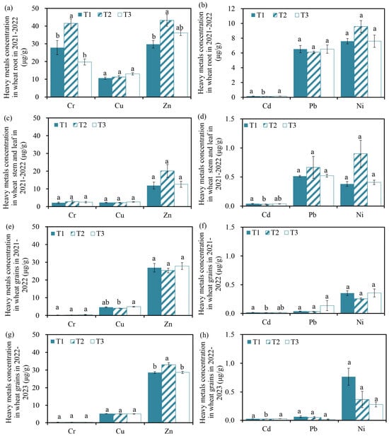 Heavy metal concentrations of winter wheat components with different fertilizer treatments in 2021–2023. (a,b); Heavy metals concentration in wheat root in 2021–2022. (c,d); Heavy metals concentration in wheat stem and leaf in 2021–2022. (e,f); Heavy metals concentration in wheat grains in 20212022. (g,h); Heavy metals concentration in wheat grains in 2022–2023. Note: Different lowercase letters indicate significant differences among different fertilizer treatments (p < 0.05) for each heavy metal.
