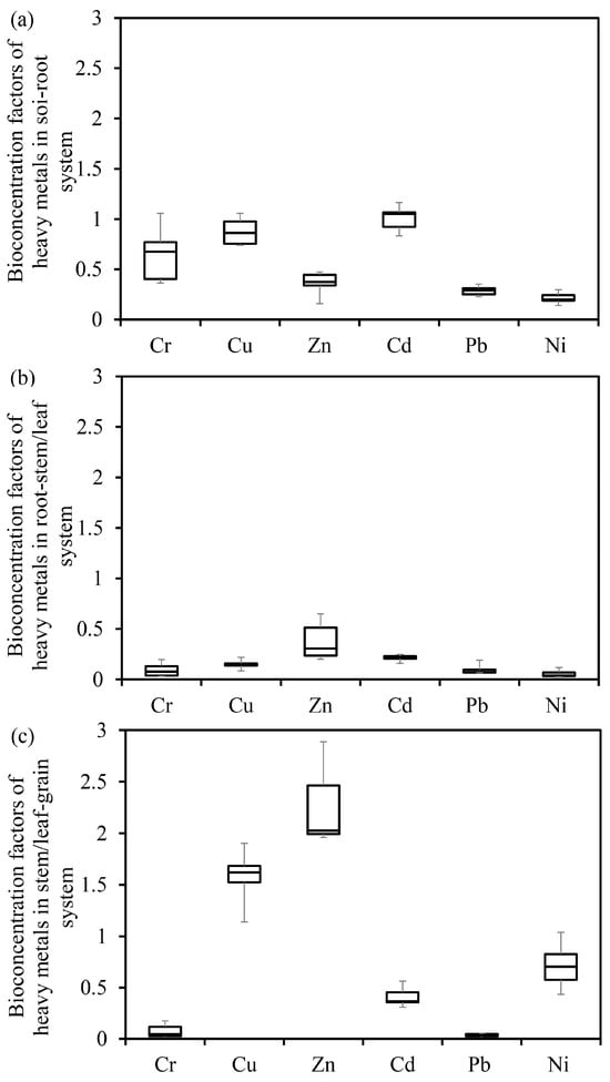 Bioconcentration factors of heavy metals in soil-wheat system in 2021–2022. (a); Bioconcentration factors of heavy metals in soil-root system. (b); Bioconcentration factors of heavy metals in root-stem/leaf system. (c); Bioconcentration factors of heavy metals in stem/leaf grain system.
