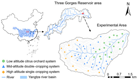 The study watershed is located in the head region of the TGRA (31.04°–31.10° N, 110.59°–110.68° E) (Figure 1), and the watershed area is 12.0 km2, with minimum and maximum elevations of 185.2 m and 1187.8 m, respectively, and an average slope of 25.8°. The watershed is representative of the typical agroecosystem in the reservoir area. This area has a humid subtropical monsoon climate with an annual mean temperature and rainfall of 22.1 °C and 1114.9 mm, respectively [25]. The geological structure is mainly composed of a low mountain valley area of purple sand shale, and the landform is mainly mountainous and hilly. Inceptisols account for 78.7% of the soil in cultivated land. The mainstream planting systems are the low-altitude citrus orchard system (≤600 m), the mid-altitude double-cropping system (600–900 m), and the high-altitude single-cropping system (≥900 m).