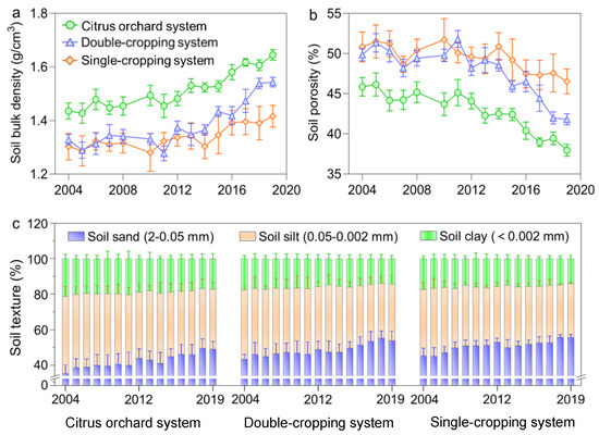 Variations in soil physical properties in the study watershed from 2004 to 2019. (a) Soil bulk density; (b) Soil porosity; (c) Soil texture.