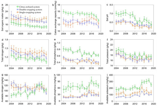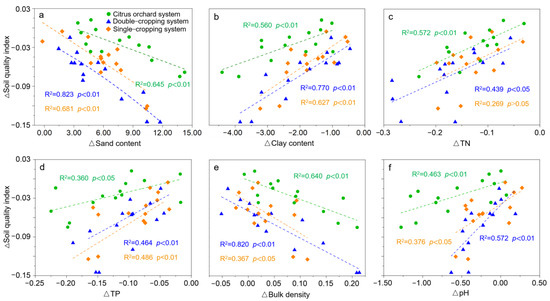 Therefore, the deterioration of the soil physicochemical properties caused by the soil erosion and the excessive application of nitrogen fertilizer led to soil degradation and the SQI decrease in the three planting systems. In the citrus orchard system, the soil SP, silt, clay, SOM, CEC, pH, TN, TP, and TK decreased by 7.91%, 9.85%, 3.89%, 2.79 g/kg, 2.72 cmol/kg, 1.28, 0.23 g/kg, 0.20 g/kg, and 2.09 g/kg, while the soil BD, sand, AN, AP, and AK increased by 0.21 g/cm3, 13.74%, 22.85 mg/kg, 16.22 mg/kg, and 71.52 mg/kg; in the double-cropping system, the soil SP, silt, clay, SOM, CEC, pH, TN, TP, TK, and AN decreased by 8.06%, 6.92%, 3.49%, 4.34 g/kg, 2.18 cmol/kg, 0.41, 0.27 g/kg, 0.15 g/kg, 1.49 g/kg, and 36.8 mg/kg, while the soil BD, sand, AP, and AK increased by 0.22 g/cm3, 10.41%, 7.67 mg/kg, and 44.66 mg/kg; in the single-cropping system, the soil SP, silt, clay, CEC, pH, TN, TP, TK, and AN decreased by 4.30%, 7.09%, 3.23%, 0.14 cmol/kg, 0.42, 0.20 g/kg, 0.17 g/kg, 2.05 g/kg, and 17.98 mg/kg, while the soil BD, sand, SOM, AP, and AK increased by 0.11 g/cm3, 10.32%, 0.23 g/kg, 12.07 mg/kg, and 28.16 mg/kg (Figure 2 and Figure 3). Thus, the difference in the degree of soil degradation and the SQI decline was due to the differences in soil physicochemical properties caused by the soil erosion and fertilizer application rate among the three planting systems during the study period.