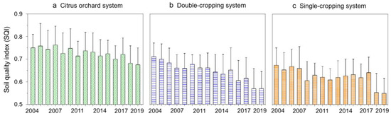 Variations in the soil quality index of citrus orchard system (a), double-cropping system (b) and single-cropping system (c) in the study watershed from 2004 to 2019.