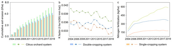 Variations in the cumulative soil erosion (a), the K factor (b), and the amount of nitrogen fertilizer applied (c) in the study watershed from 2004 to 2019.