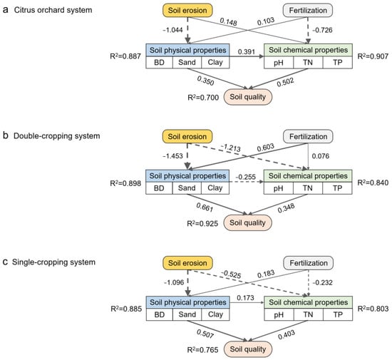 Mechanisms involving soil erosion and fertilization influence soil quality in the citrus orchard system (a), the double-cropping system (b) and the single-cropping system (c). The number on the arrow represents the standardized path coefficient. The width of the arrow indicates the strength of the direct effect; the wider the arrow is, the greater the strength. The solid line indicates a positive effect, and the dashed line indicates a negative effect. Models were assessed via goodness of fit (GoF) statistics. The GoFs of (a–c) were 0.832, 0.861, and 0.778, respectively.
