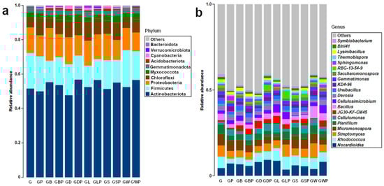 Soil samples displayed some differentially abundant genera under various treatments (Figure 3b). Ramlibacter Burkholderiaceae and Polyangium Polyangiaceae were the characteristics of the control (G), while Hamadaea Micromonosporaceae and Saccharimonadales TM7 characterized GP. Both Streptococcus Streptococcaceae and Methylobacterium Beijerinckiaceae were the defining genera for GD, while only Georgenia Actinomycetaceae was the GDP indicator. GB had the most significant genus-level biomarkers, including Sphingomonas Sphingomonadaceae, Terrabacter Dermatophilaceae, and Bradyrhizobium Xanthobacteraceae, but no genera corresponding to GBP were identified. GS had one characterizing genus, RBG-13-54-9, while two genera were identified as characterizing taxa in GSP, Sporocytophaga Cytophagaceae, and Sorangium Polyangiaceae. Both Nocardioides Nocardioidaceae and Akkermansia Akkermansiaceae were enriched in GL, but only JG30-KF-CM45 was associated with GLP. Rhodococcus Mycobacteriaceae and Lactobacillus Lactobacillaceae were associated with GW, and Cellulosimicrobium was associated with GWP.