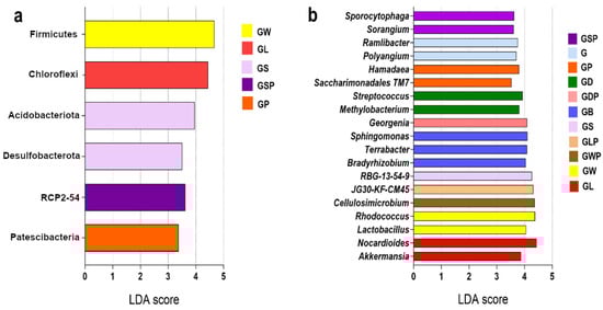 Although there were significant overlaps in both phylum- and genus-level microbiota structure between different treatments, the linear discriminant analysis (LDA) effect size (LEfSe) biomarker discovery tool revealed that some of the phyla and genera were differentially abundant and are indicators of the differences in microbiota between the various soil samples under different treatments. At the phylum level, Firmicutes was the defining phyla for the GW, and Chloroflexi was the most enriched in GL. Acidobacteriota and Desulfobacterota were identified as indicators in GS, while the GSP and GP were defined by RCP2-54 and Patescibacteria, respectively (Figure 3a).