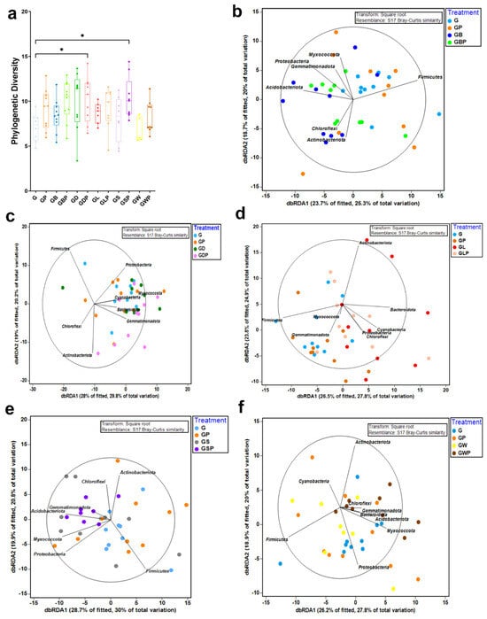 Diversity of soil microbiota in different treatments: (a) microbiota diversity in different treatments measured with the indicator phylogenetic diversity; (b–f) ordination of individual samples with distance-based redundancy analysis (dbRDA) of Bray–Curtis distance depicting spatial differences in microbiota among all treatments. Abbreviations: buffel grass (G); PHY (P); butterfly pea (B), desmanthus (D), lablab (L), Wynn cassia (W); and seca stylo (S). The asterisk indicates a significant change * = p < 0.05.