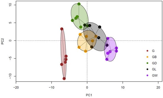 More than 90% of the microbiota in each group belonged to the five most abundant phyla. Actinobacteriota (Figure S3b,c), Firmicutes, and Proteobacteria were represented in similar proportions in all treatments (Figure S3b,c). The GL had the highest proportion of Chloroflexi followed by the GP and GSP, while the GB had the lowest representation of Myxococcota.