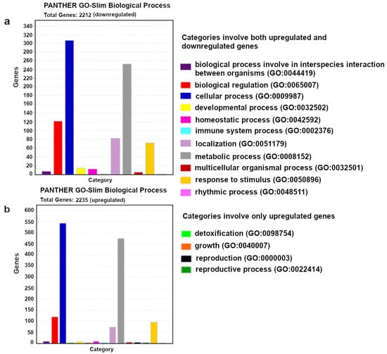 Differentially expressed genes in biological processes in butterfly pea treatment: panel (a) represents categories associated with 2212 downregulated genes; panel (b) represents categories related to 2235 upregulated genes.
