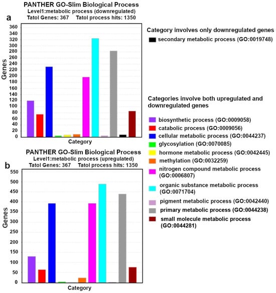 Differentially expressed genes at metabolic process GO categories altered by lablab coculture: panel (a) represents categories associated with 367 downregulated genes; panel (b) represents categories related to 503 upregulated genes.
