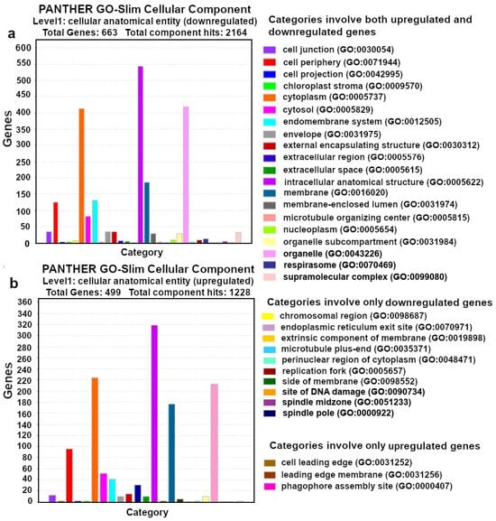 Differentially expressed genes at the cellular anatomical entity level in seca stylo treatment (GS): panel (a) represents categories associated with 663 downregulated genes; panel (b) represents categories related to 499 upregulated genes.