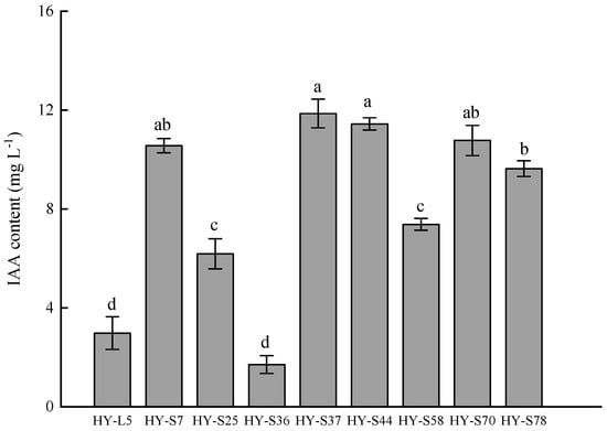 Figure 2. Content of indole-3-acetic acid (IAA) produced by different strains. Lowercase letters represent significant differences between different strains (p < 0.05).