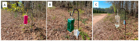 Three colors were selected for this experiment: purple, green, and no-color [transparent]. The traps were colored purple and green by being fully wrapped around the plastic bottles using Scotch tape (purple or green; Scotch® #35 Orange Vinyl Electrical Tape 10869-DL-5, 1.9 × 20.1 m × 0.2 mm, 3 M, St. Paul, MN, USA) (Figure 1A,B). The colorless trap received no tape wrapping.