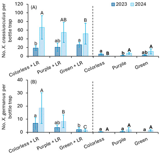 Mean (±SE) number of (A) X. crassiusculus, and (B) X. germanus adults collected in eight weeks after exposing colored-bottle traps in the ornamental nursery in 2023 and 2024. The same letter cases (lower and upper cases for 2023 and 2024, respectively, and bold or nonbold within +LR and −LR ethanol lure) above bars indicate no significant difference using the Tukey–Kramer test (α = 0.05).