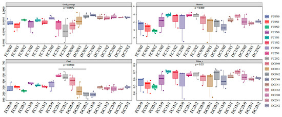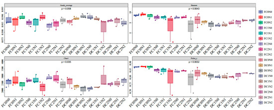 Fungal community α-diversity under different treatments in moderately saline soil. F, Sampling on the first day of cultivation; D, sampling after the end of cultivation; C0N0, no biomass material or nitrogen addition; C0N1, no addition of biomass materials and addition of 0.015 g of N; C0N2, no addition of biomass materials and addition of 0.03 g of N; C1N0, corn straw addition and no nitrogen addition; C1N1, corn straw addition and addition of 0.015 g of N; C1N2, corn straw addition and addition of 0.03 g of N; C2N0, biochar addition and no nitrogen addition; C2N1, biochar addition and addition of 0.015 g of N; C2N2, biochar addition and addition of 0.03 g of N.