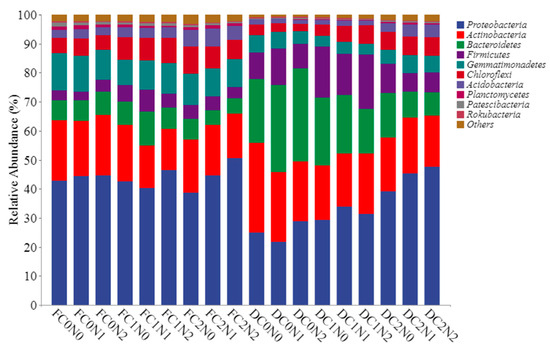Bacterial community composition in moderately saline soil at the phylum level. F, Sampling on the first day of cultivation; D, sampling after the end of cultivation; C0N0, no biomass material or nitrogen addition; C0N1, no addition of biomass materials and addition of 0.015 g of N; C0N2, no addition of biomass materials and addition of 0.03 g of N; C1N0, corn straw addition and no nitrogen addition; C1N1, corn straw addition and addition of 0.015 g of N; C1N2, corn straw addition and addition of 0.03 g of N; C2N0, biochar addition and no nitrogen addition; C2N1, biochar addition and addition of 0.015 g of N; C2N2, biochar addition and addition of 0.03 g of N.