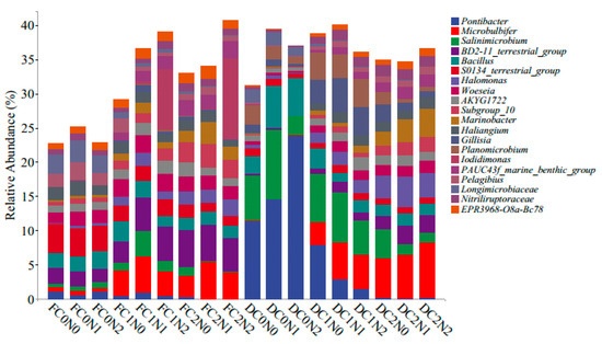 From Figure 3, it can be seen that the bacterial genera with the top 10 relative abundances underwent significant changes in the F and D phases. From high to low, they are classified as Pontibacter, microbubbier, salinimicrobium, and BD2-11, respectively, Terrestrial_Group, Bacillus, S0134_Terrestrial_Group, Halomonas, Woeseia, AKYG1722, Subgroup_10, and Marinobacter. From Figure 3, it can be seen that the relative abundances of Pontibacter, salinimicrobium, halomonas, and Marinobacter in phase D were significantly increased compared to phase F. The relative abundances of Pontibacter, (11.36~23.86%), Salinimicrobium (2.84~10.17%), and Bacillus (2.63~6.12%) treated with phase D C0 were significantly increased compared to the other treatments.