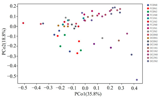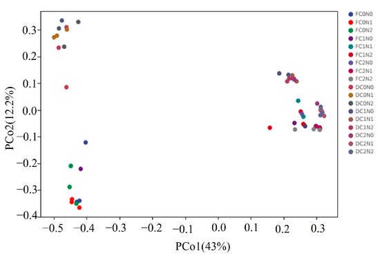 Principal coordinate analysis (PCoA) of soil bacterial community in moderately saline soil under different treatments. F, Sampling on the first day of cultivation; D, sampling after the end of cultivation; C0N0, no biomass material or nitrogen addition; C0N1, no addition of biomass materials and addition of 0.015 g of N; C0N2, no addition of biomass materials and addition of 0.03 g of N; C1N0, corn straw addition and no nitrogen addition; C1N1, corn straw addition and addition of 0.015 g of N; C1N2, corn straw addition and addition of 0.03 g of N; C2N0, biochar addition and no nitrogen addition; C2N1, biochar addition and addition of 0.015 g of N; C2N2, biochar addition and addition of 0.03 g of N.