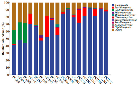 Fungal community composition in moderately saline soil at the phylum level. F, Sampling on the first day of cultivation; D, sampling after the end of cultivation; C0N0, no biomass material or nitrogen addition; C0N1, no addition of biomass materials and addition of 0.015 g of N; C0N2, no addition of biomass materials and addition of 0.03 g of N; C1N0, corn straw addition and no nitrogen addition; C1N1, corn straw addition and addition of 0.015 g of N; C1N2, corn straw addition and addition of 0.03 g of N; C2N0, biochar addition and no nitrogen addition; C2N1, biochar addition and addition of 0.015 g of N; C2N2, biochar addition and addition of 0.03 g of N.