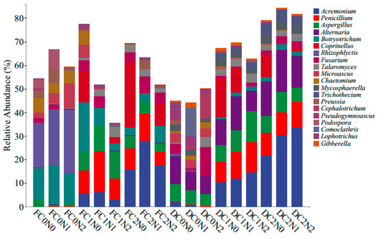 From Figure 7, it can be seen that the fungal genera with the top 10 relative abundances underwent significant changes in the F and D phases. The average relative abundances, from high to low, were Acremonium, Penicillium, Aspergillus, Alternia, Botryotrichum, Coprinellus, Rhizophlyctis, Fusarium, and Talaromyces, respectively. The relative abundances of Acremonium, Penicillium and Talaromyces in the C1 and C2 treatments were significantly increased compared to the C0 treatment. The relative abundances of Acremonium, Penicillium and Talaromyces in the C1 treatment increased by 18.57 times, 53.34 times, and 3.75 times, respectively, compared to the C0 treatment. The relative abundances of Acremonium, Penicillium and Talaromyces in the C2 treatment increased by 52.27 times, 44.25 times, and 3.19 times, respectively. The relative abundances of Alternatia (7.6~18.1%), Mycosphaerella (1.4~3.9%), Trichothecium (0.03~4.28%), and Gibberella (0.24~1.10%) in phase D were significantly increased compared to phase F.