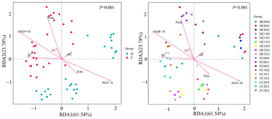 Redundancy analysis was conducted between the bacterial communities and soil environment factors. From Figure 9, we found that the first axis explained 61.54% of the soil factor variation, and the second axis explained 23.78%, with a cumulative contribution rate of 85.32%. There was a significant correlation between the soil environment factors and the changes in the bacterial communities. The F and D phases were clearly distinguished. The bacterial community structure was mainly influenced by ammonium nitrogen, nitrate nitrogen, and nitrate reductase in the moderately saline soils, while urease and pH had little effect on the bacterial community structure. Ammonium nitrogen and nitrate reductase mainly affected the F-phase bacterial community, while nitrate nitrogen mainly affected the D-phase bacterial community. As shown in Figure 9, we also found that the different treatments tended to converge more closely and were distinguished by the addition of the different biomass materials, indicating that the addition of the different biomass materials significantly affected the bacterial community structure in the moderately saline soil; on the contrary, the bacterial communities had a stronger response to the biomass materials in the moderately saline soils than to the different nitrogen application rates.