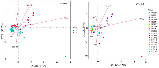 Correlation between environmental factors and bacterial community in moderately saline soil. NH4+-N, ammonium nitrogen; NO3--N, nitrate nitrogen; EC, electrical conductivity; Ur, urease; Nitra, nitrate reductase; Nitri, nitrite reductase. F, Sampling on the first day of cultivation; D, sampling after the end of cultivation; C0N0, no biomass material or nitrogen addition; C0N1, no addition of biomass materials and addition of 0.015 g of N; C0N2, no addition of biomass materials and addition of 0.03 g of N; C1N0, corn straw addition and no nitrogen addition; C1N1, corn straw addition and addition of 0.015 g of N; C1N2, corn straw addition and addition of 0.03 g of N; C2N0, biochar addition and no nitrogen addition; C2N1, biochar addition and addition of 0.015 g of N; C2N2, biochar addition and addition of 0.03 g of N.