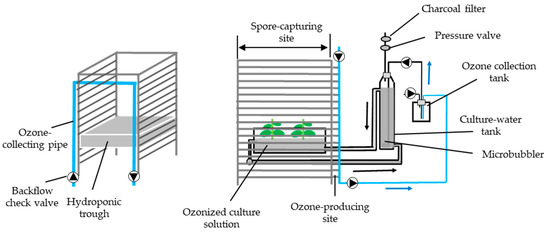 Schematic representation of the dual control system of rhizosphere and aerial pathogens for hydroponic plants by use of an ozone-generative spore precipitator [14]. The device possessed multiple ozone-generative spore precipitation cylinders installed on a rectangular frame at a constant interval. The ozone produced in each cylinder was transferred to an ozone collection tank by an aspirator pump and supplied to the culture solution tank after adjusting the ozone concentration. Finally, the ozonized culture solution was circulated between the tank and hydroponic culture trough. Ozone is highly insoluble in water under normal temperature and pressure and can easily be converted into oxygen, such that it is impossible to dissolve ozone in water at the required concentrations for disinfection. Sterilization of pathogens in water was conducted by bubbling ozone-containing air into water. The strong oxidizing ability of ozone sterilizes microbes in the water when they come into contact with the air bubbles containing ozone. Black and blue arrows represent the direction of ozone gas and ozonized culture solution, respectively.