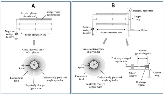 (A) Schematic representation of the original spore-precipitation cylinder to trap airborne fungal spores [24]. Copper wire (conductor) was covered with a transparent acrylic cylinder (insulator) and held at the middle, and both ends of the cylinder with insulating silicon stoppers. The cylinders were arranged in parallel. The copper wires were linked to a negative voltage booster (upper). The polarized dielectric cylinder produces an electrostatic field to cause the dipole on the spore. Spores were attracted to the cylinder through dielectrophoretic movement (lower). (B) Illustration depicting a spore-precipitation cylinder designed for ozone production [14]. Each cylinder has a region at one end to generate ozone, and the remaining part of the cylinder is used to capture airborne spores. The copper wire was positively charged, and the electrostatic field was formed in the space around the dielectrically polarized cylinder. The ability to capture spores was the same as that of the original spore-precipitation cylinder. One tip end of the copper wire inside the acrylic cylinder was sharpened to create a needle pole. Continuous corona discharge (streamer discharge) was induced by the electric field between the tip end of the copper wire and a grounded copper ring attached to the cylinder edge. The ozone produced in each cylinder was transferred to a collection tank by an aspirator pump.