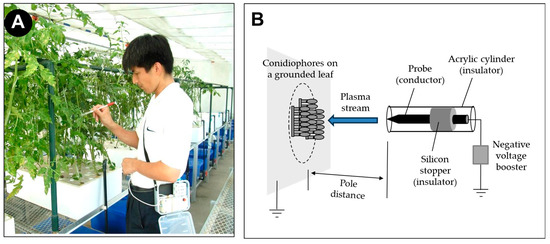 (A) A portable plasma-stream exposer with a battery-operated voltage booster [26]. (B) The diagram shows the spatial relationship between the charged probe tip and the grounded tomato leaf. The distance between the tip and the leaf was adjusted to determine the optimal tip position at which conidiophores were instantly destroyed by the plasma stream.
