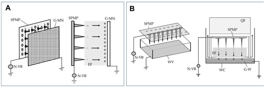 Figure 4A depicts the initial device, comprising a negatively charged spiked perforated metal net and a grounded metal net, arranged in parallel at specific intervals. While initially designed to capture secondhand smoke from tobacco, its efficacy extended to capturing plant pathogenic fungal spores and pollen carried by the wind (unpublished work). Figure 4B illustrates a variation in the device where the grounded metal net was substituted with grounded water. This modification enabled the capture of droplet-transmitted viruses in the groundwater of the device, making it applicable to the agricultural sector. This device could effectively remove indoor pollutants, such as pesticides (fungicides, insecticides, herbicides, and hormones), which were dispersed outdoors and entered nearby residential environments (unpublished work).