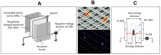 Recently, Kakutani et al. [20] developed an electric soil cover to eradicate adult houseflies (Musca domestica) emerging from underground pupae in a greenhouse soil bed (Figure 6A). Houseflies pose a risk of transmitting pathogenic Escherichia coli O157, which can cause food poisoning in humans who consume contaminated fresh food [30,31]. Housefly larvae develop in cattle feces and ingest E. coli O157, allowing adult houseflies to transfer the bacteria from cattle manure used as soil fertilizer to the food supply chain, contaminating cultivated and postharvest crops [32,33,34,35]. The soil cover comprised pulse-charged and grounded metal nets [20]. It was positioned on a plastic grating with multiple cells to provide a climbing path for adult houseflies emerging on the soil surface (Figure 6B). Houseflies that climbed up the grating’s wall and reached the arcing zone were exposed to arc discharges from the negatively pulse-charged metal net, causing them to be knocked down onto the soil by the impact of the discharge (Figure 6B). The impact was potent enough to kill the houseflies.
