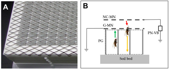 (A) Schematic representation of an electric soil cover designed to eliminate adult houseflies emerging from underground pupae [20]. The cover consists of a negatively charged, non-insulated metal net (NC-MN) linked to a pulse-charging negative voltage booster (PN-VB) and a grounded metal net (G-MN). It is positioned on a plastic grating (PG). (B) Adult houseflies that emerge from underground pupae climb along the cell wall (green arrow) of the grating and encounter an arc discharge (red arrow) from the pulse-charged net when they reach the arcing zone. Subsequently, they are knocked downward (orange arrow) by the strong impact of the arc discharge.