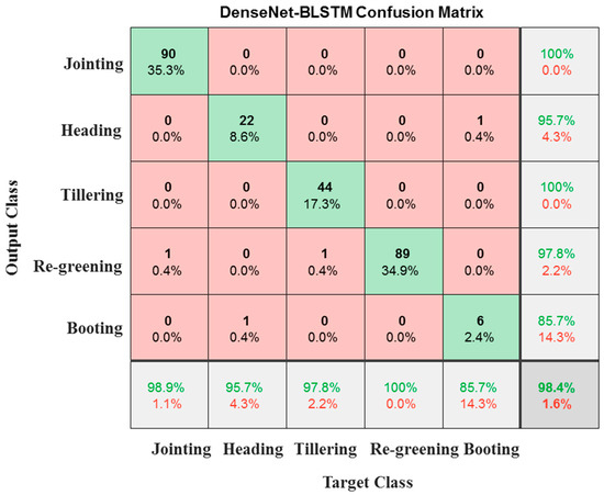 - The combination of DenseNet and BiLSTM improved the network’s capability to learn complex features and improved the extraction of spatiotemporal information from image sequences, enhancing the accuracy of recognizing the growth stages of wheat.