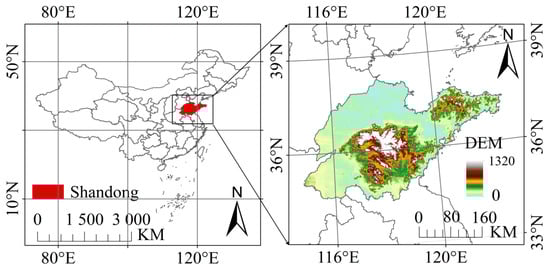 The research area for this study is Shandong Province, located in Eastern China (Figure 1). It spans approximately 158,100 km2, situated between latitudes 34°23′-38°17′ N and longitudes 114°48′–122°42′ E [32]. With a coastal strip in the northeastern portion of the province and a high elevation in the center, Shandong Province boasts a diverse and complex topography that includes plains, hills, basins, mountains, lakes, and more. One of the most notable features of Shandong Province’s terrain is the high level of naturalization within it. Winter wheat and summer corn are the primary crops farmed in China’s Shandong Province, a significant agricultural region [33].