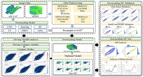 Experimentally, b1, b2, b3, b4, NDVI, EVI, NIRv, OSAVI, SAVI, LAI, FPAR, and LST were selected as the driving variables for constructing the downscaling model. During the model construction process, the resolution of the driving variables was first adjusted to match that of the eSIF data. Then, the corresponding image values were extracted according to the image points of the eSIF, to maintain data accuracy and consistency. The experiments were selected from October 2018 to May 2019 and from October 2019 to May 2020 for modeling, respectively. The downscaling model construction process is illustrated in Figure 2.