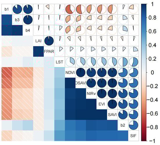 The bidirectional reflectance distribution function adjustment (BRDF) product of the Moderate Resolution Imaging Spectroradiometer (MODIS) MCD43A4 version 6 for 2018–2020 was selected as the main driving variable for constructing the downscaling model. The BRDF includes reflectance data in four bands: red (b1), near-infrared (b2), blue (b3), and green (b4) at a resolution of 500 m. Additionally, the Normalized Difference Vegetation Index (NDVI), Enhanced Vegetation Index (EVI), Soil-Adjusted Vegetation Index (SAVI), Near-Infrared Vegetation Index (NIRv), Optimized Soil-Adjusted Vegetation Index (OSAVI), Leaf Area Index (LAI), and Vegetation Percentage of Cover (FPAR) data of MOD15A2 with 500 m spatial resolution were selected as the important driving variables, which can represent the characteristics of the data structure of the SIF both empirically and mechanically and have been widely used in the inverse of the ecological remote sensing [41]. To ensure the consistency of spatial resolution of the above feature variables, they were resampled to 1 km, and the surface temperature (LST) data of the MOD11A2 product were introduced in this study with a resolution of 1 km to capture the physiological features of SIF more accurately [42].