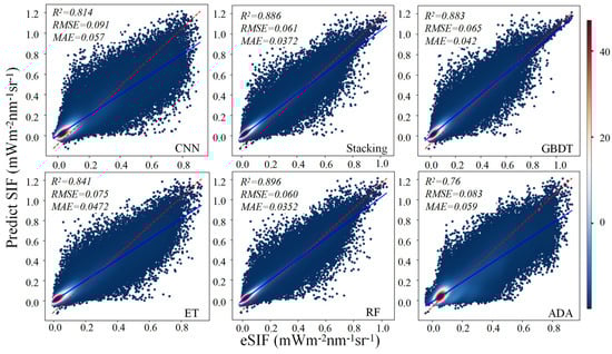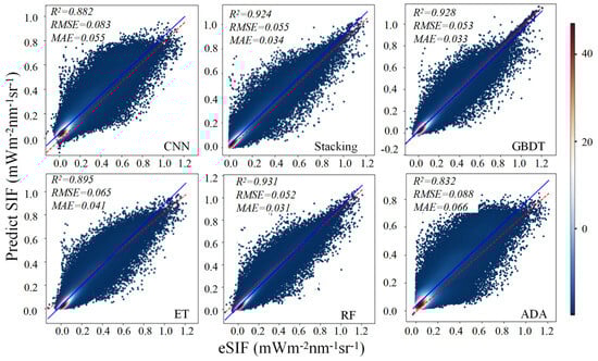 The models selected for this study include CNN, Stacking integrated learning model, RF, ET, ADA, and GBDT. These models were optimized, and the parameters were adjusted to the appropriate values for training. The dataset 1 was input into each of the six models for training, and the experiment extracted a total of 138,845 pieces of sample data, of which 70% was used as the training set and 30% as the test set. Figure 4 displays the density plots of the training true values and the predicted eSIF for each model. The plots show that, despite using the same downscaled sample dataset, the models exhibit good precision, indicating high accuracy. Although the accuracy metrics are satisfactory, the fitted lines in the plots are somewhat dispersed from the ideal 1:1 line. Table 1 presents the accuracy evaluation metrics for the training results from each model using dataset 1.
