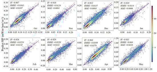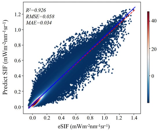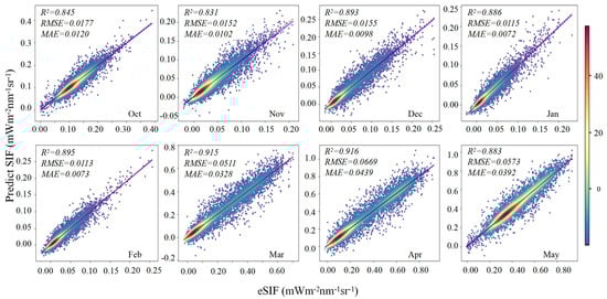 For the dataset from October 2019 to May 2020, a downscaled model based on the RF algorithm was trained using the same driving variables. Figure 6 demonstrates the fitted density plot of the real value and the predicted eSIF based on the RF algorithm, and the results show that the model has a great fitting effect. The specific accuracy metrics are R2 = 0.926, RMSE = 0.058, and MAE = 0.034. The fitted line is very close to the 1:1 line, which shows a high degree of consistency between the model predictions and the actual observations.