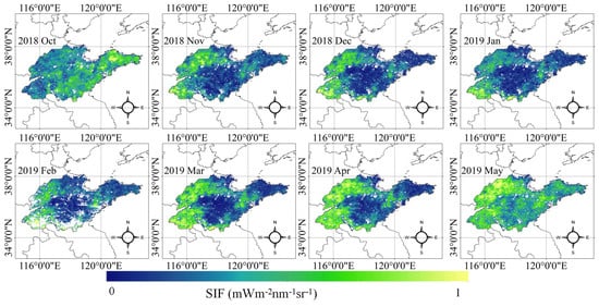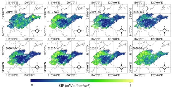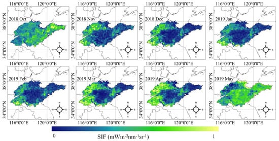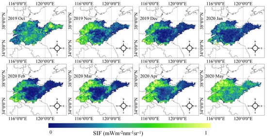 From October 2019 to May 2020, the same methodology was applied to generate a 1 km resolution SIF product through monthly-scale SIF inversion for Shandong Province. Figure 9 and Figure 10 present the inversion results, showing both the synthesized eSIF and the downscaled 1 km SIF. Compared to the previous year, the SIF trends are the same. By comparing the SIF data products before and after downscaling, the distribution of data is unchanged, and the downscaling model constructed based on the Random Forest (RF) algorithm can accurately invert the 1 km SIF, which can more accurately observe the changes in vegetation cover and provide strong support for studying agriculture-related information through SIF changes.