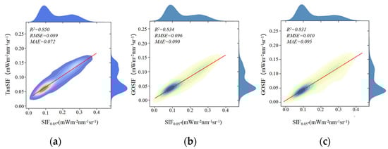 Density fitting map of 1 km SIF and other SIF satellite products verified. (a) 2018–2019 TanSIF. (b) 2018–2019 GOSIF. (c) 2019–2020 GOSIF.