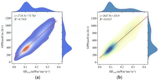 Correlation analysis of SIF with a GPP density plot. (a) 2018–2019. (b) 2019–2020.